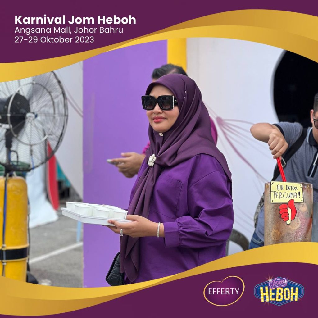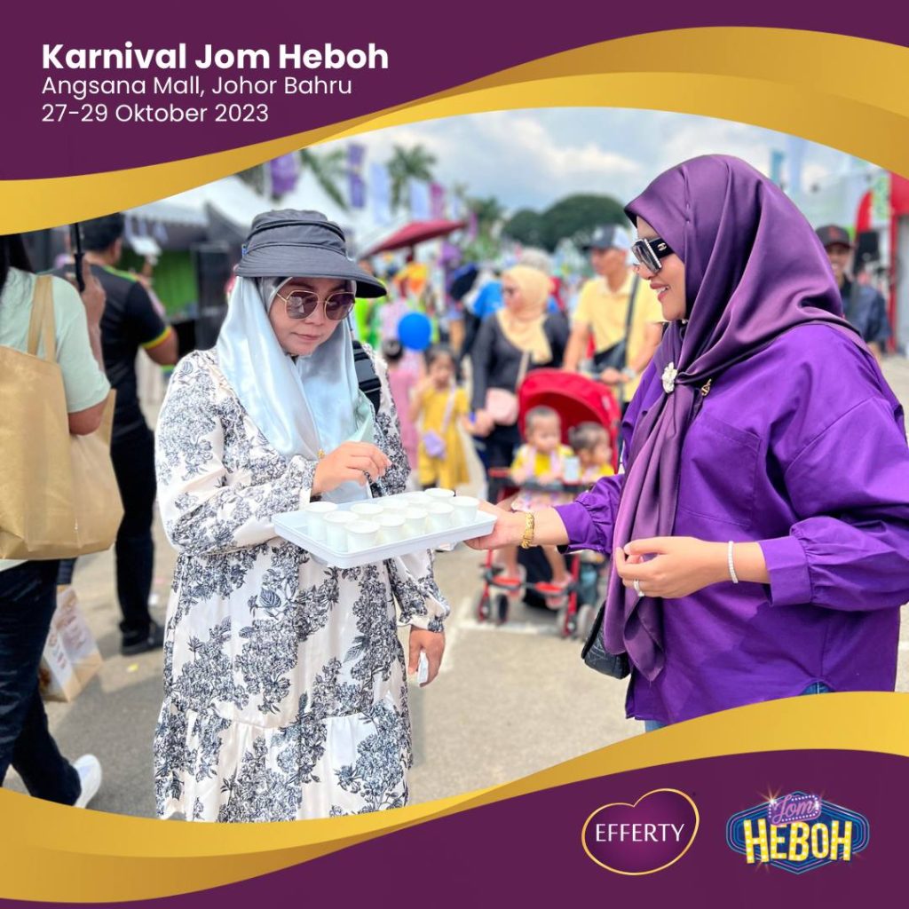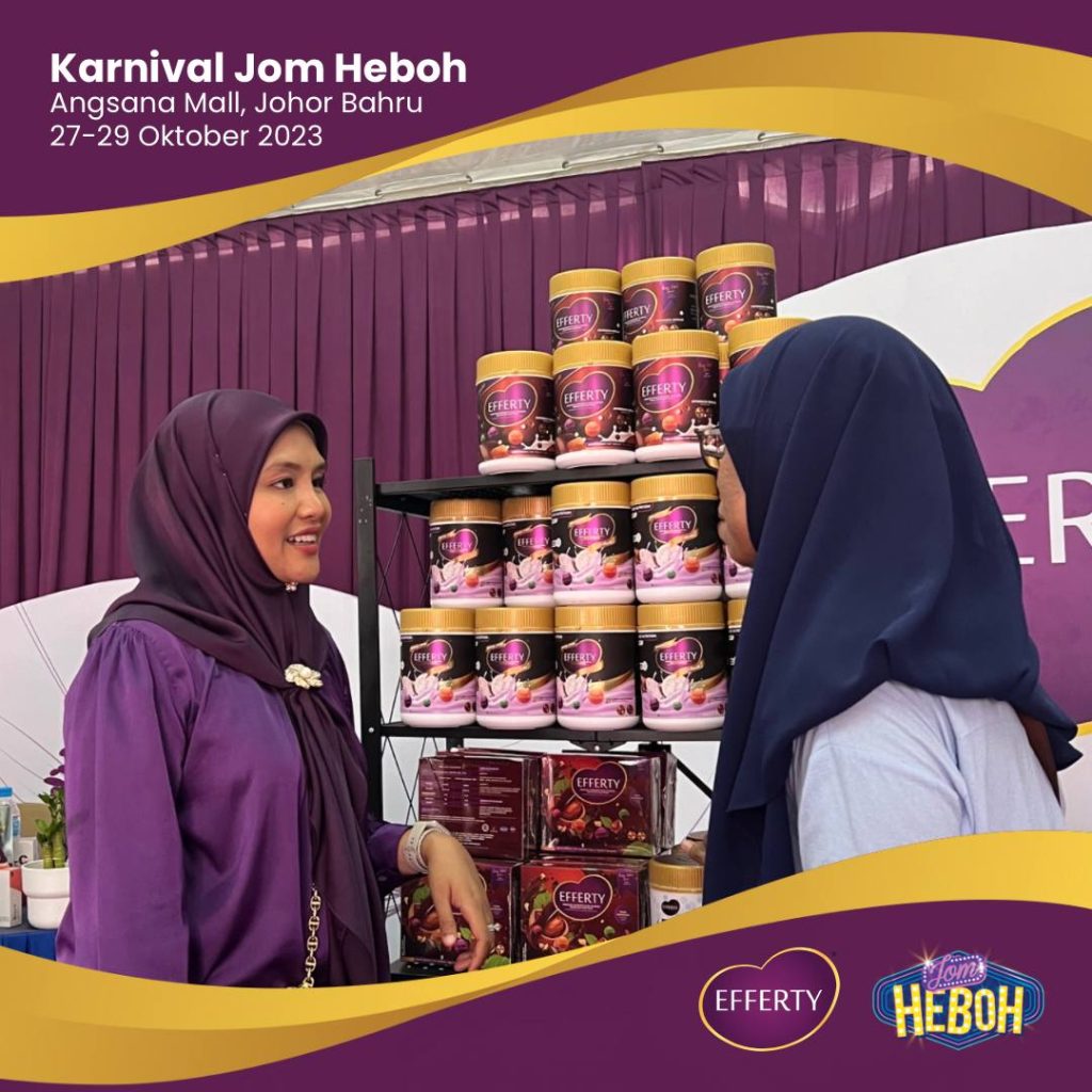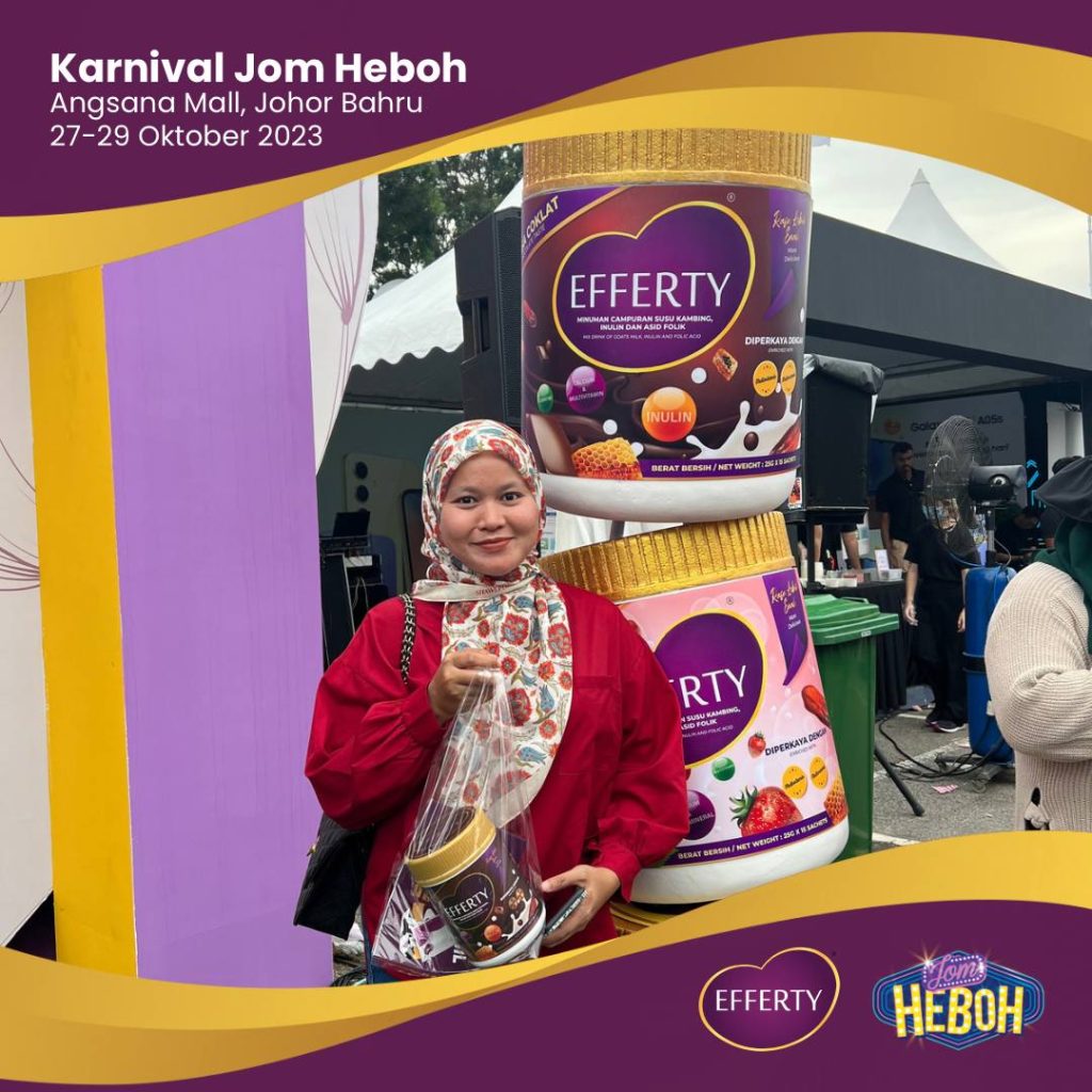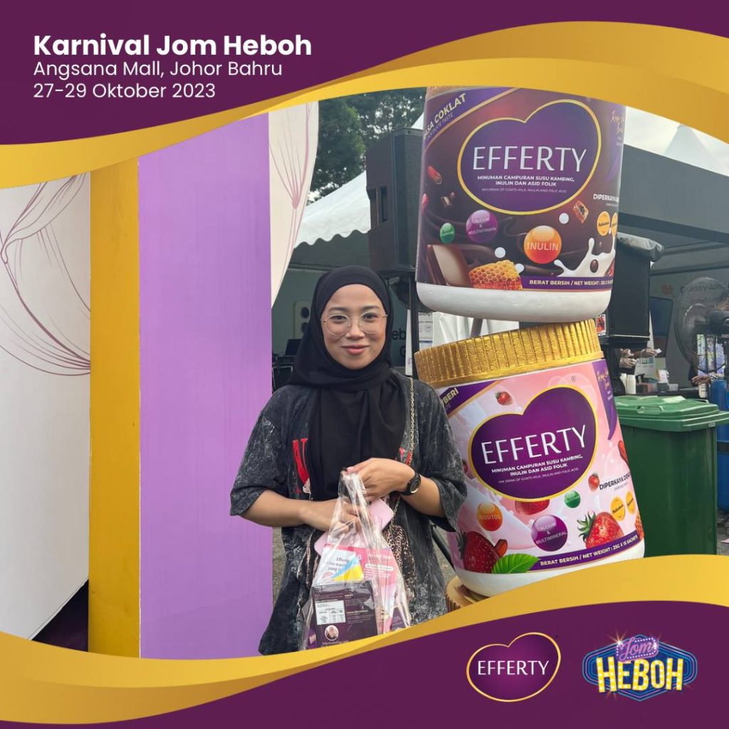 Saya ingin berkongsi pengalaman saya selama tiga hari turun padang di Karnival Jom Heboh. Walaupun saya sedang mengandung, tenaga dan semangat saya tetap tinggi. Mungkin salah satu faktor yang menyumbang kepada kecergasan saya adalah minum susu Efferty setiap hari. Produk ini bukan hanya memberi manfaat kepada pelanggan, tetapi juga kepada saya sebagai pengguna setia.